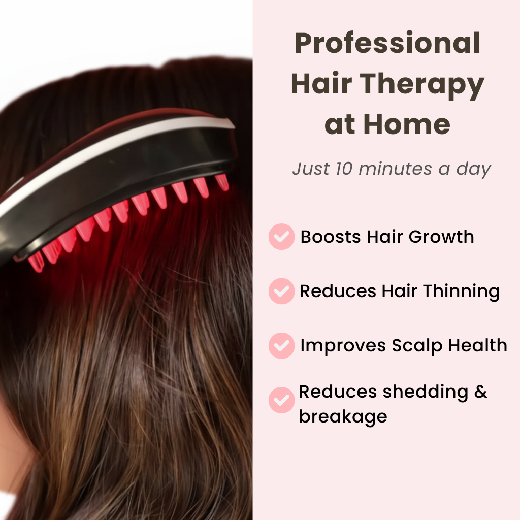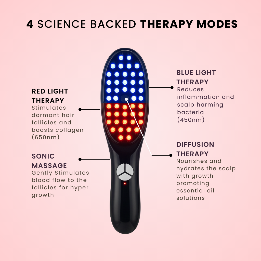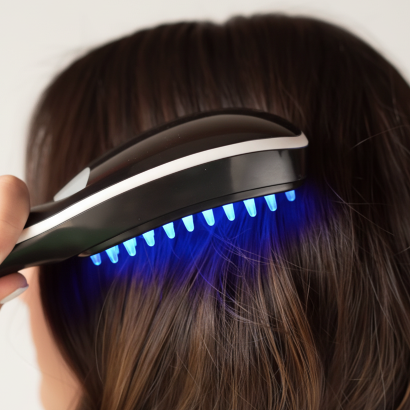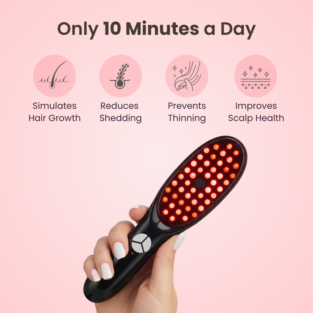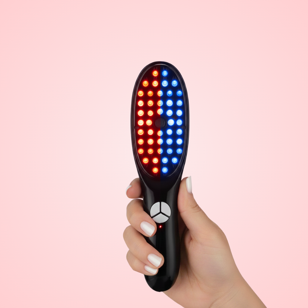 Slowly comb through your hair for 5–10 minutes. The micro-vibrations will massage the serum into the roots while the light energizes your follicles.